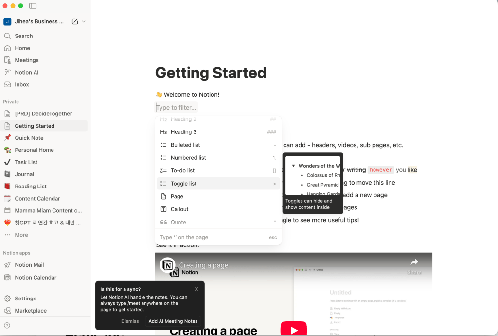 Notion에서 텍스트, 이미지, 체크리스트, 토글, 테이블, 데이터베이스는 모두 다른 기능처럼 보이지만, 내부적으로는 모두 동일한 성질의 “블록(Block)”입니다. 이러한 설계가 중요한 이유는: